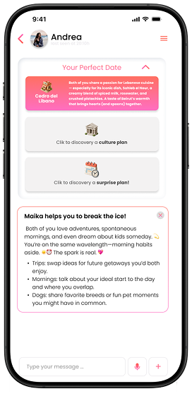 Buscamos que las conexiones no se queden en el chat. Por eso creamos My Perfect Date, donde cada día te proponemos 3 planes personalizados según los gustos de ambos. Con un clic puedes reservar directamente.