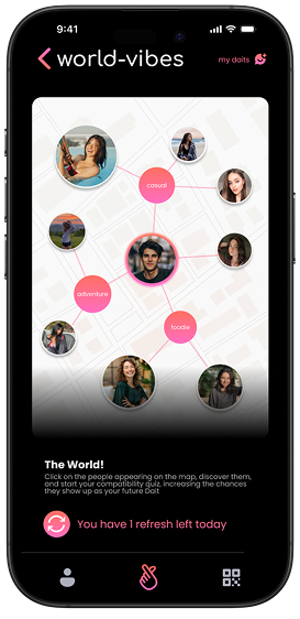 Te ofrecemos la posibilidad de escanear a otros usuarios de Dait — amigos, o gente que conozcas en una fiesta, bar o donde surja— para que podáis chatear, descubrir planes en común y medir vuestro nivel de compatibilidad al instante.